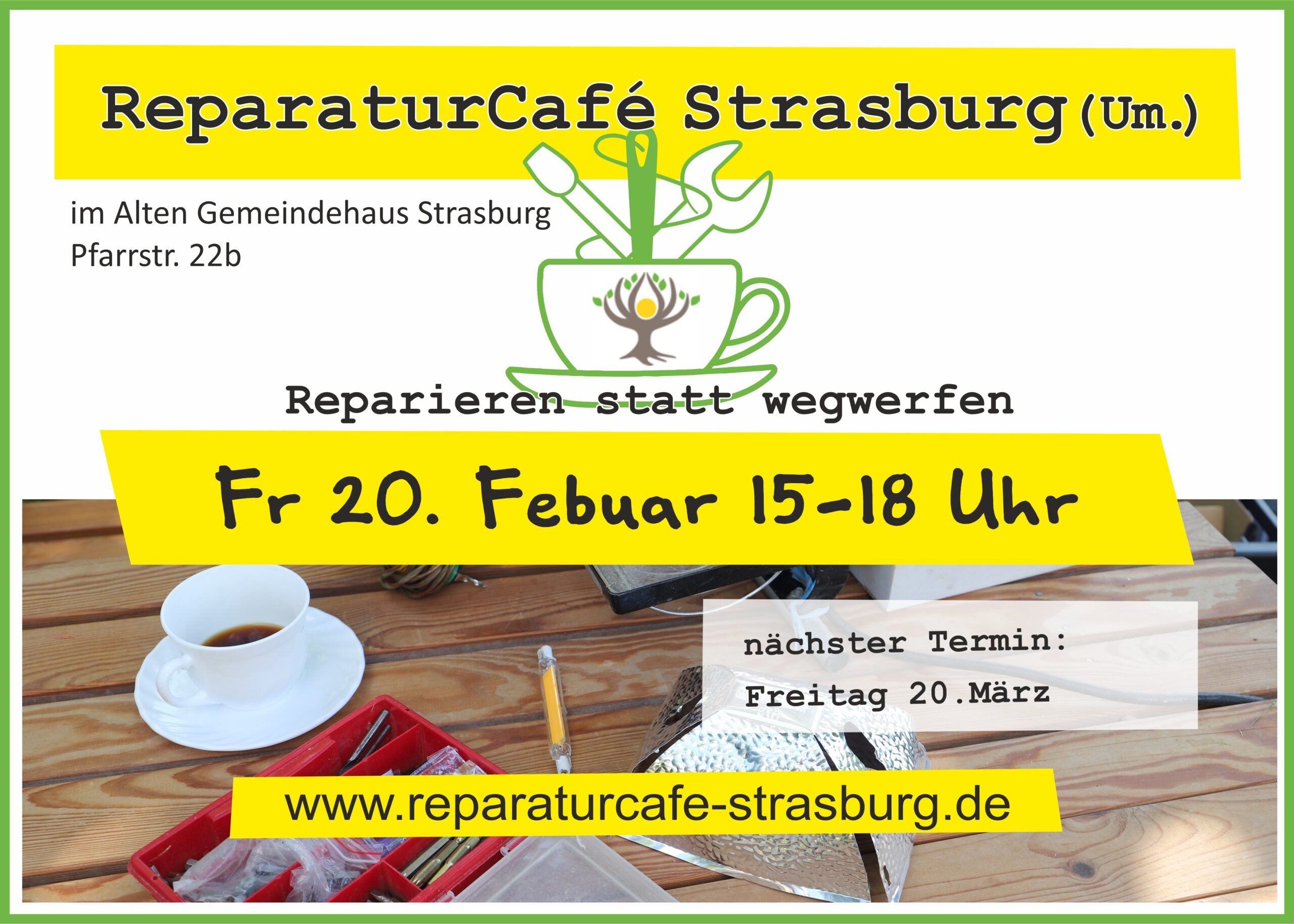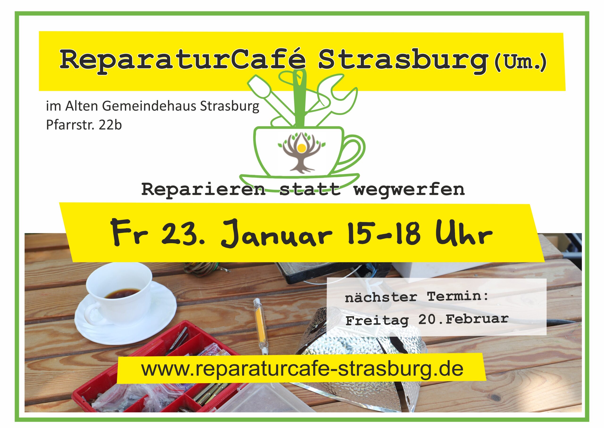Wir veranstalten einmal im Monat im Alten Gemeindehaus Strasburg einen Reparatur-Treff, wo Menschen ihre kaputten Alltagsgegenstände mitbringen können und ehrenamtliche Hilfe beim Reparieren erhalten.