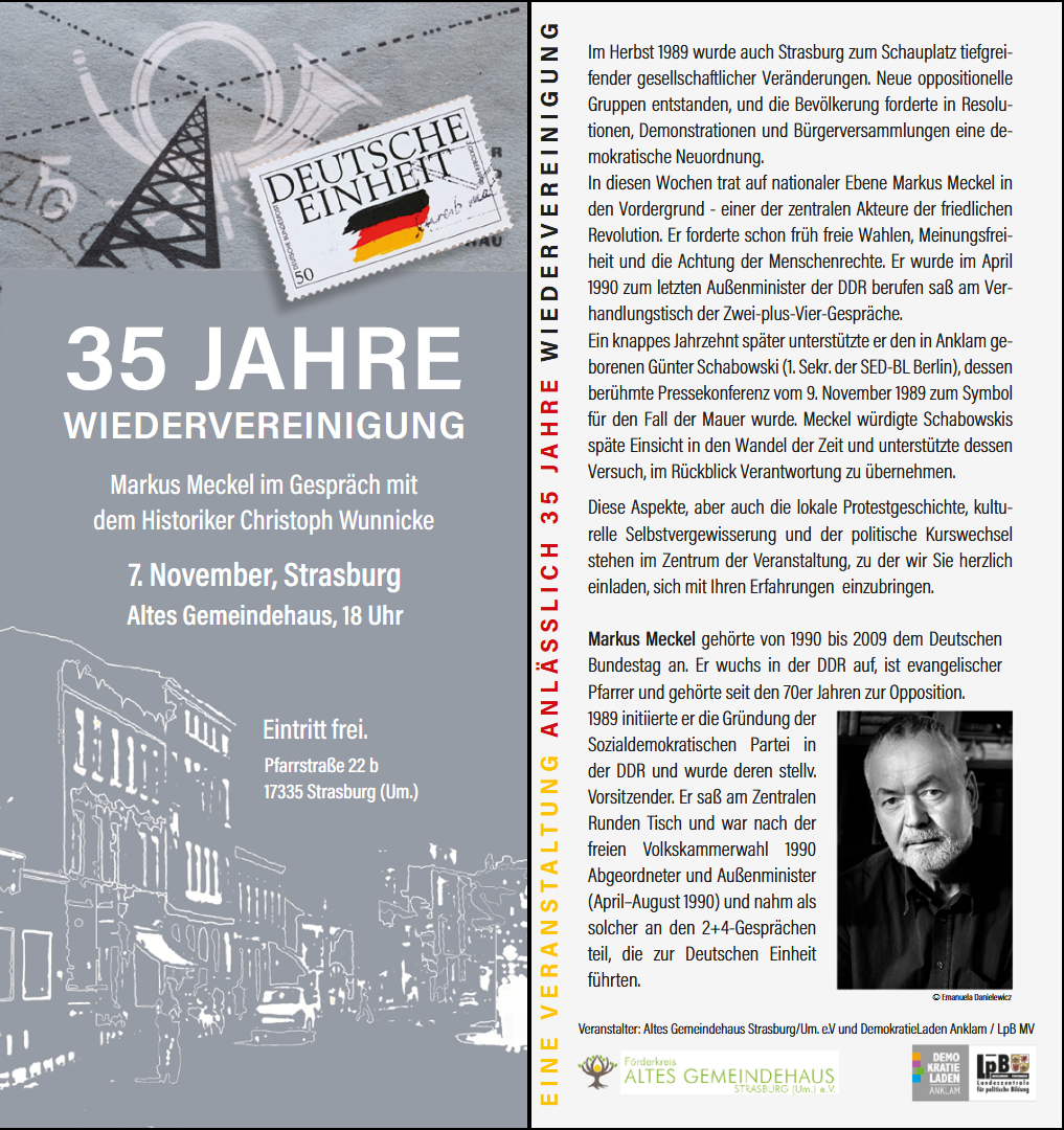 Zum Thema “ 35 Jahre Deutsche Einheit“ gibt es sicherlich die verschiedensten Perspektiven. Lassen Sie uns einander zuhören und gemeinsam entdecken, was in den letzten 35 Jahren verloren und was gewonnen wurde. Die Veranstaltung ist kostenlos. Wir freuen uns über Ihre Teilnahme.