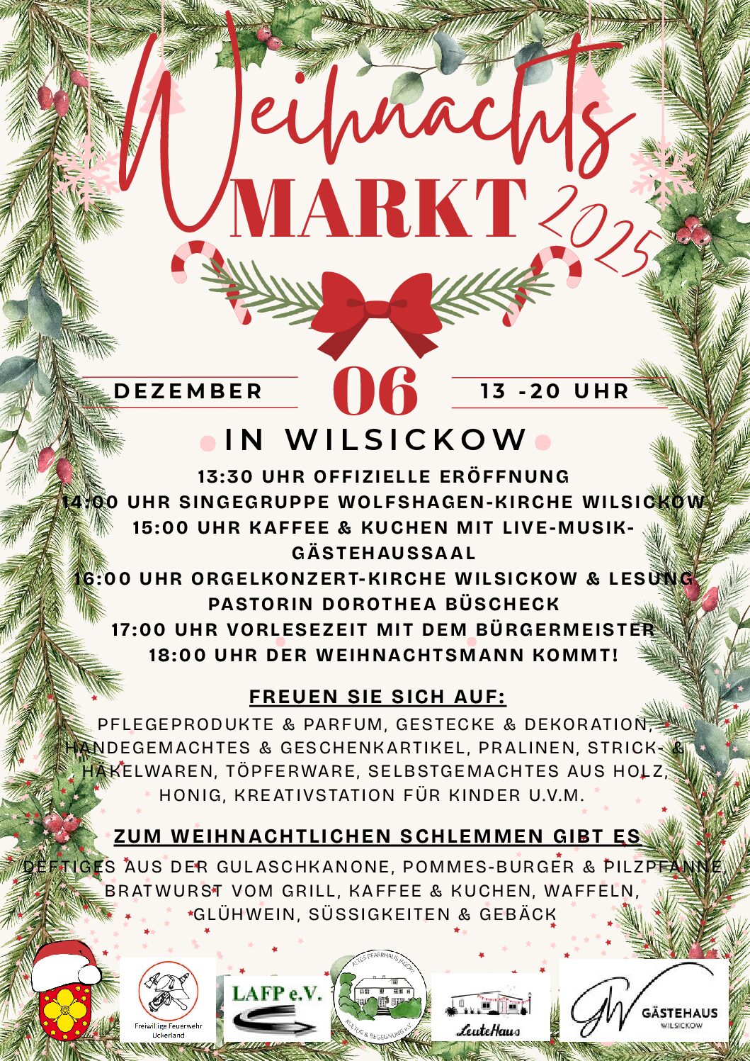 Gemeindeweihnachtsmarkt trifft Dorfweihnacht! Gemeinsam mit dem Gästehaus Wilsickow veranstaltet die Gemeinde Uckerland den Weihnachtsmarkt 2025 in diesem Jahr in Wilsickow. Hierzu laden wir Sie rechtherzlich ein. Freuen Sie sich auf viele tolle Händler, köstliche Speisen und Getränke, weihnachtliche Stimmung, Musik und natürlich auf den Weihnachtsmann.
